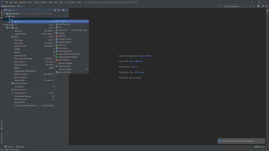 Name it whatever you like and click “Finish”. Upon creating the project, we can now see the project view on the left, we’ll create a class in the “src” folder called Main. You do this by right-clicking the “src” folder and selecting “New > Java Class”.