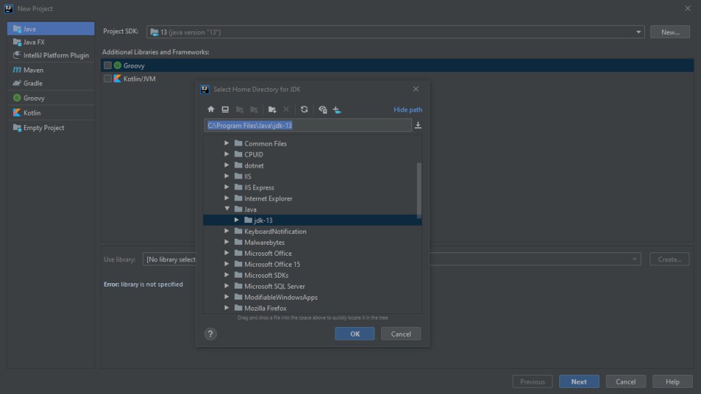 Open IntelliJ and we’ll start by creating our first project. Make sure to set the SDK to the JDK we installed! If it doesn’t recognize the JDK, you’ll need to click “New” and find the file as shown below: