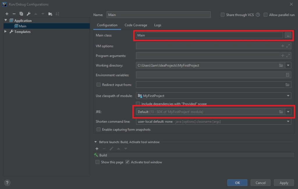 Select the class as “Main” and make sure that the “JRE” is set to the same JDK you used. We now have the bare minimum to get started with Java!