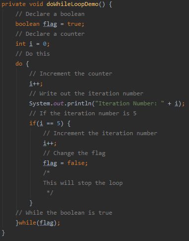 The “do while” loop is similar to the “while” loop, however this variant guarantees the loop will be executed at least once. This is because the condition checking is done at the end of the iteration as opposed to the start. This is shown below: