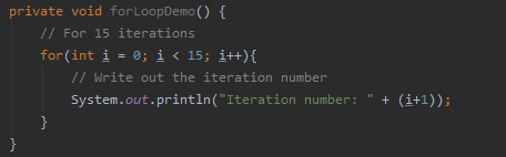The “for” loop is used to iterate over a set range of values, or even a collection of objects (we’ll get on to this in the future). You can see an example “for” loop below:
