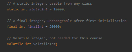Variables can also have different modifiers that change the way they behave in a program. Those modifiers are: