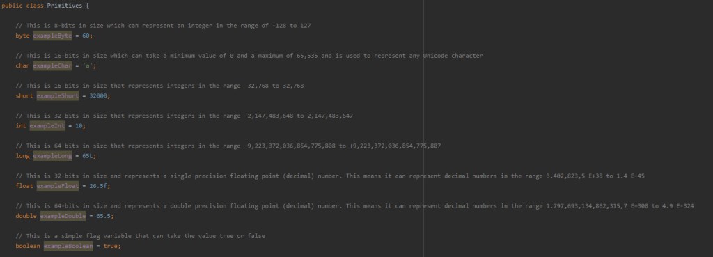 Now that we’ve been introduced to the primitives in Java, let’s take a look at how these would look in Java: