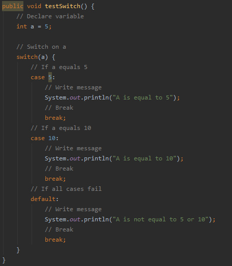 You can see that depending on what the input is, a different block of code will be executed. It is important to remember that you need to “break” after the block of code so that the program can exit the “switch” statement.