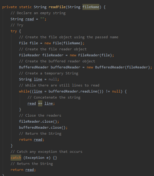 This function takes the filename of the file we want to read and returns the contents of the “.txt” file in the form of a String.