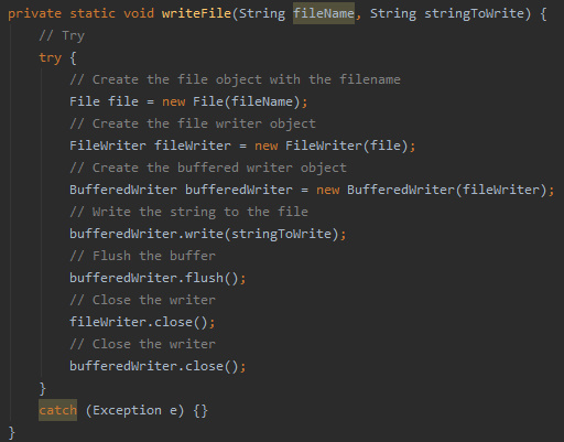 This function takes the filename of the file we want to write to and a String that we want to store and writes the string to the given file.