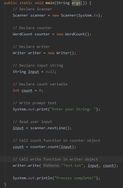So now we have the word counting class, we just need the file writer class as we saw last time. By creating a new class and copying the function from last time in we are all set to finish our main function (see above). And that’s a simple application to get an input string and count the words and write the information to a file.