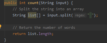 Next we want to write a function that counts the number of words in the String. To do this we are going to use the “.split()” method available to strings. We discussed this last time and with our knowledge of arrays and ArrayLists we can now demonstrate splitting.