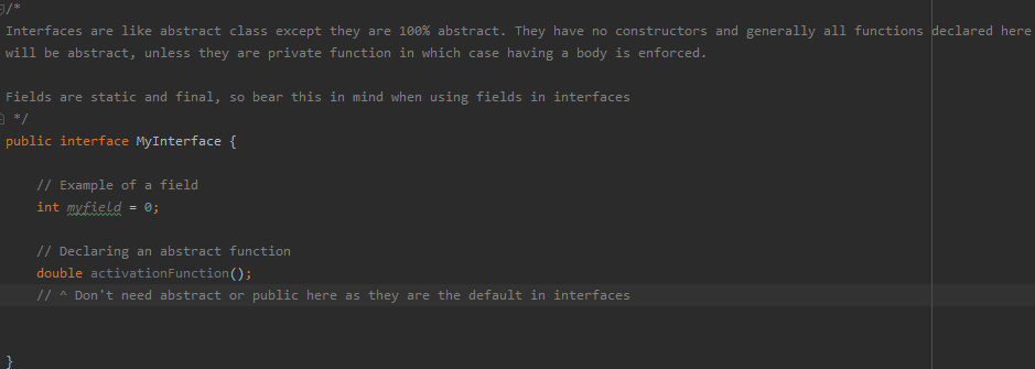 Interfaces provide an alternative method for abstraction in Java, but unlike abstract classes, interfaces are completely abstract. This means that methods are public and abstract by default. In addition, and fields are public, static and final by default.