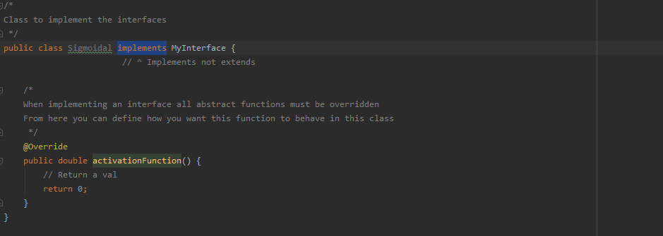On the implementation of an interface, you will be required to override all of the methods in the interface, providing your own implementations for those methods.