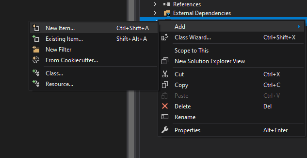 Firstly, we’ll want to create a header file and give it a name. In Visual Studio, we can do this by right clicking in project solution pane and selecting “Add -> New Item”. In the projects we’ve been using, there is a dedicated “Header files” directory that we will add it to.