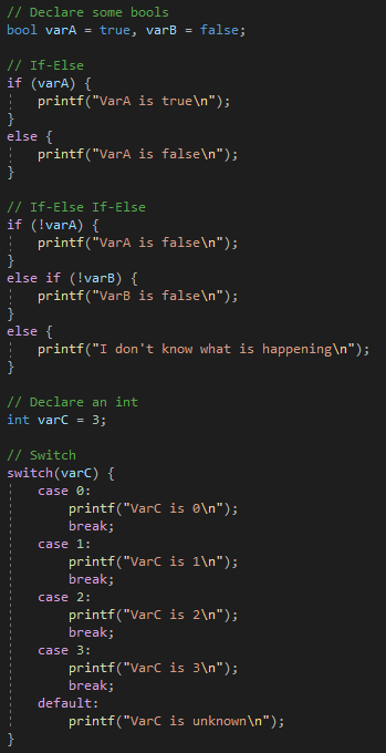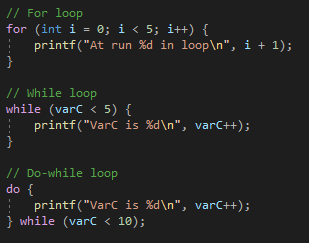 But C also has another kind of control statement; “goto”. This statement essentially tells the code to jump to a specific point in the code. Whilst this may seem great on paper, it is recommended to avoid goto, as it cam lead to buggy code, or code that is too hard to follow. It can also allow you to jump out of the scope, which can be problematic for variables in the program.