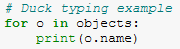 This means that you can have a list of objects displaying their name attribute, and as long as each type of object in that list has this attribute in its class definition everything will be okay. This is shown below: