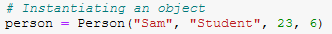 When it comes to actually instantiating an object of the class, interestingly enough, we don’t have to pass “self” to the function. We just declare the object name, assign it the constructor with the required arguments, as seen below: