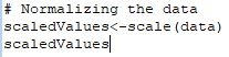 Now we’ll look at scaling the data, which is also known as normalizing the data. This is a process of converting attribute values into new values within given bounds, usually [0,1] or [-1,1]. This can be done in R as follows: