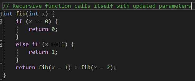 But there is a type of function used in algorithmic programming that allows for divide and conquer approaches and has numerous other applications. These are known as recursive functions. We can examine the example from the C series, for fibonacci sequence generation: