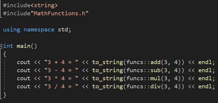 And that is the header file created, along with the corresponding source file. The last thing we need to do is include it in our code and test the functions: