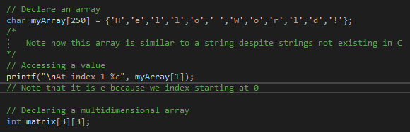 It may seem like we cannot do a great deal with C since there are so few variable types, but C does support arrays, which opens up more possibilities.